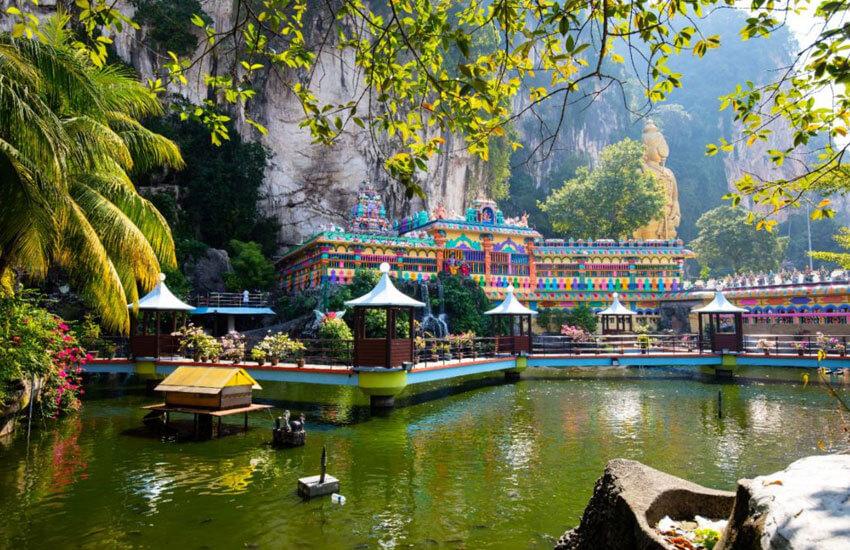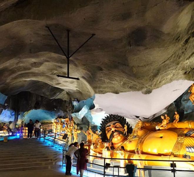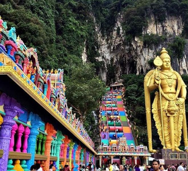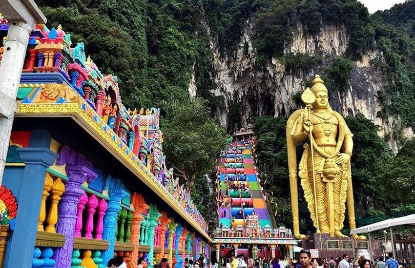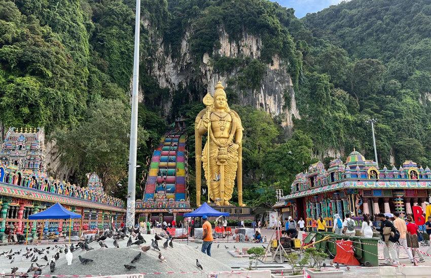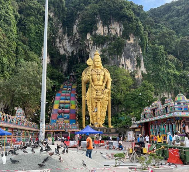 A famous Hindu temple in limestone caves with a massive golden Lord Murugan statue.