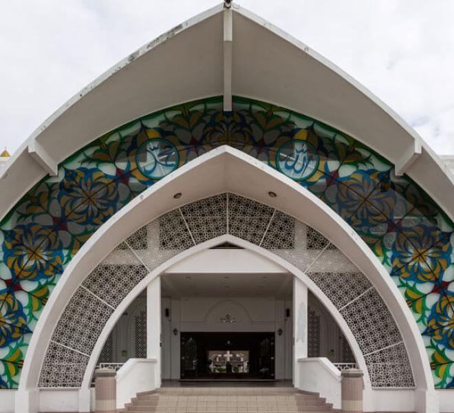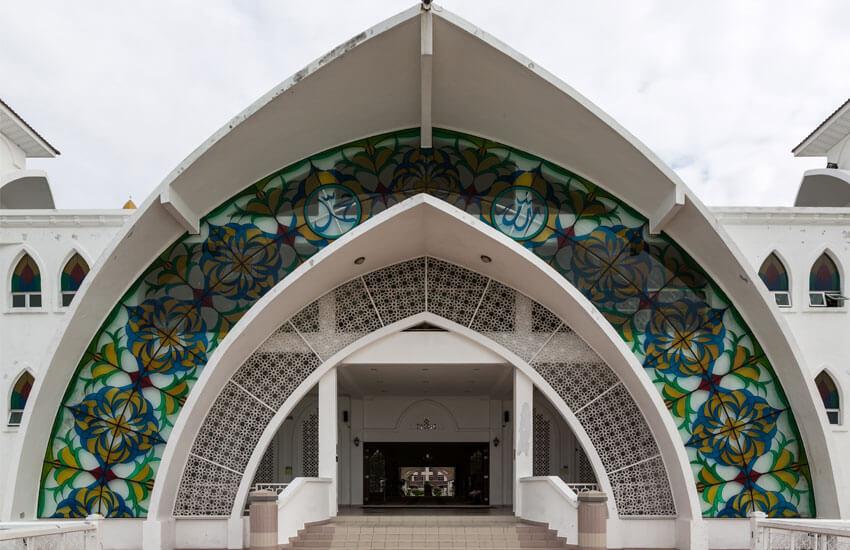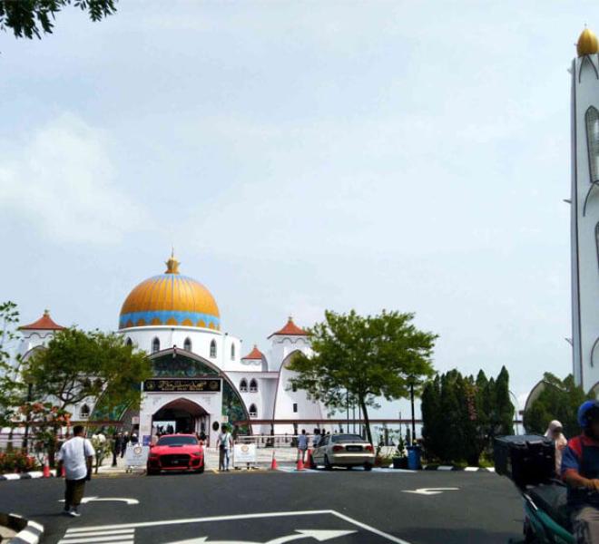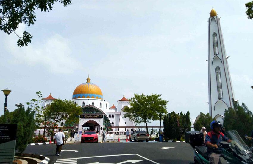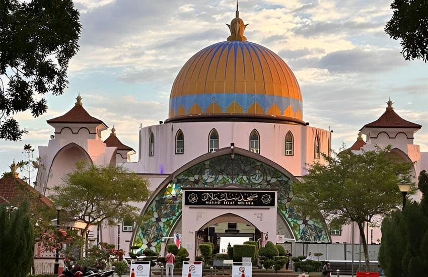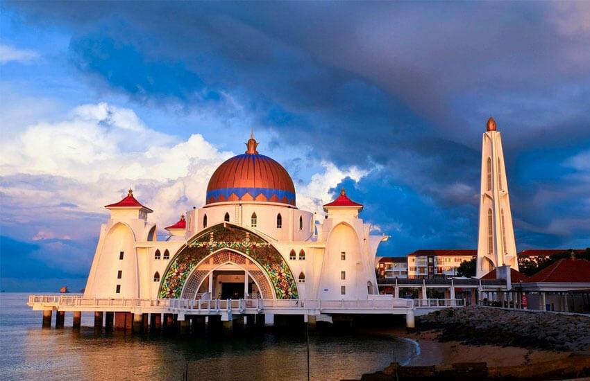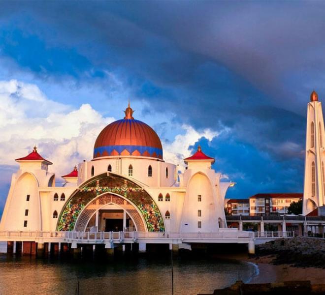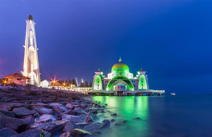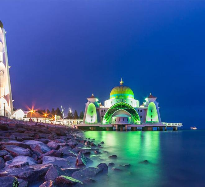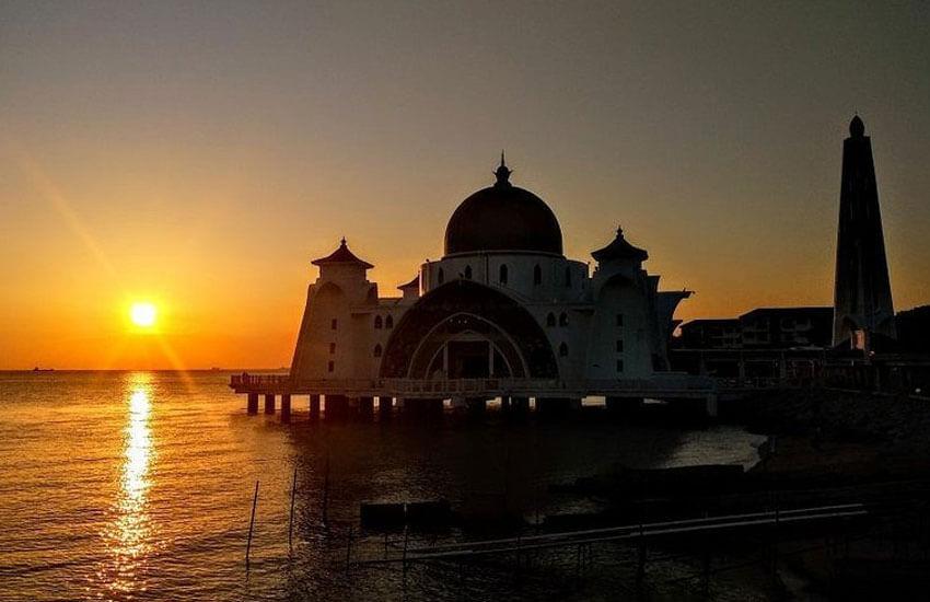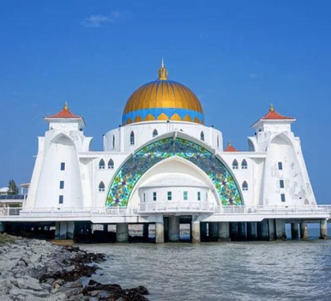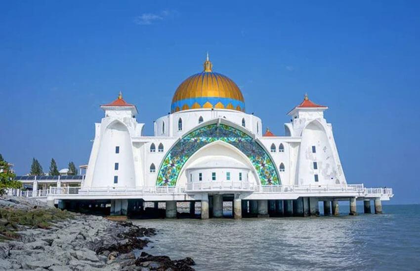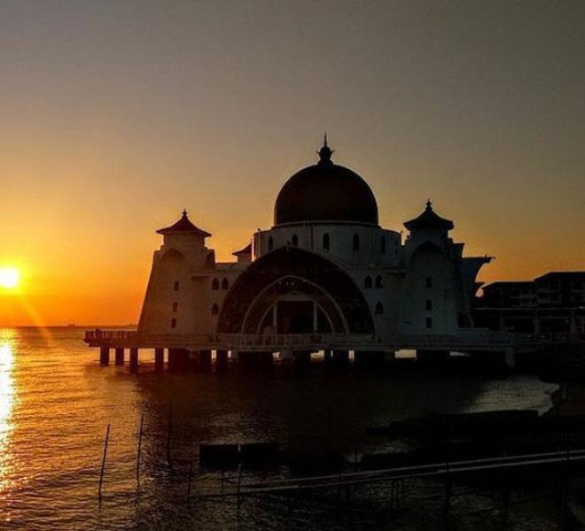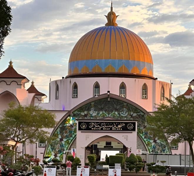 The Melaka Straits Mosque, also known as Masjid Selat, is a contemporary architectural marvel that appears to float on the waters of the Straits of Melaka during high tide. Completed in 2006, this mosque combines Middle Eastern and Malay architectural elements with modern design features, creating a striking landmark on Melaka's coastline. The mosque's gleaming white structure is accented with golden domes and a 30-meter minaret, which are beautifully illuminated with colorful lights after dark. With a capacity to accommodate up to 2,000 worshippers, the mosque welcomes Muslim visitors for prayer and non-Muslims outside prayer times (with appropriate dress). The mosque is particularly popular at sunset, when the combination of the setting sun, the mosque's reflection in the surrounding waters, and the illuminated building create a magical tableau that attracts photographers and visitors from around the world.