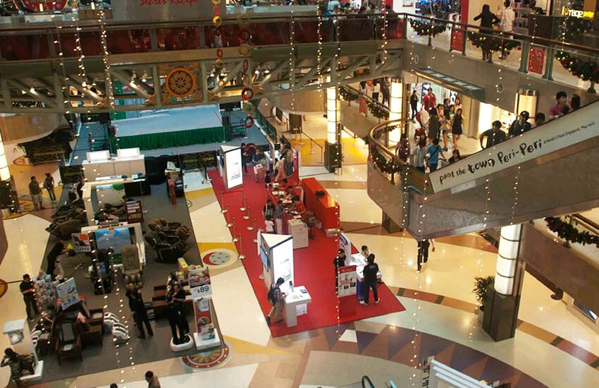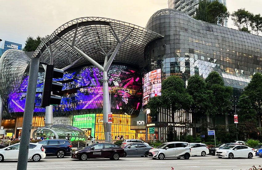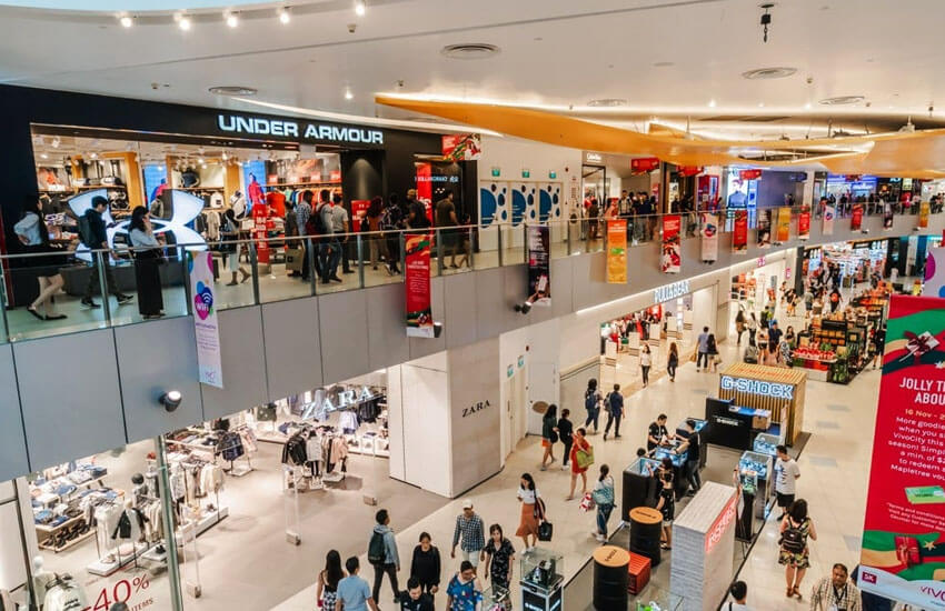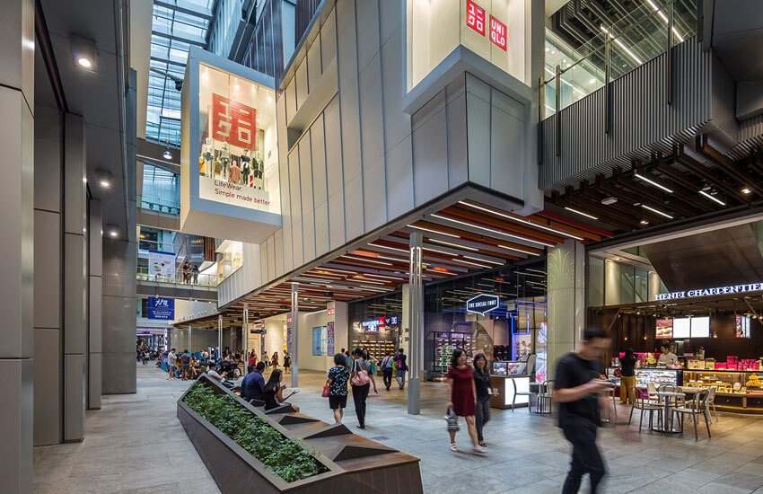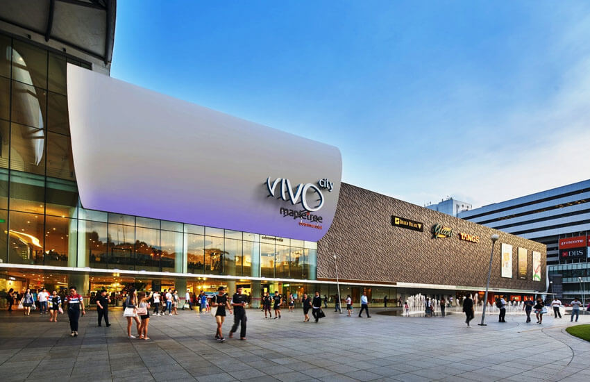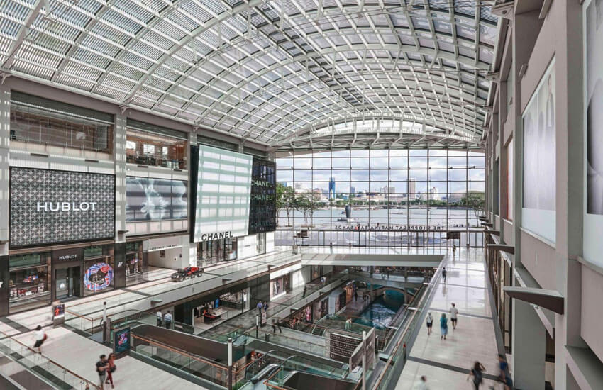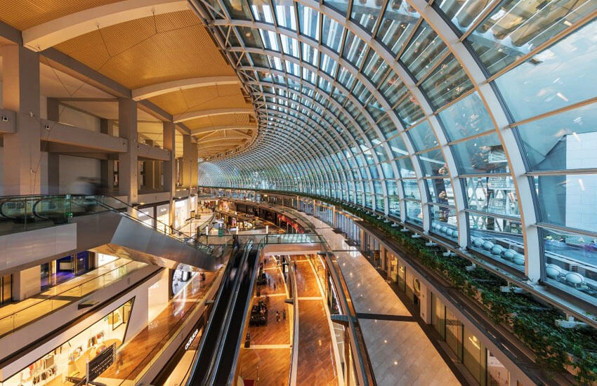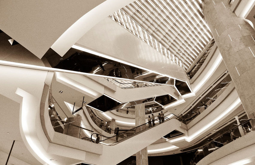 Vertical shopping mall featuring outdoor escalators and terraces.